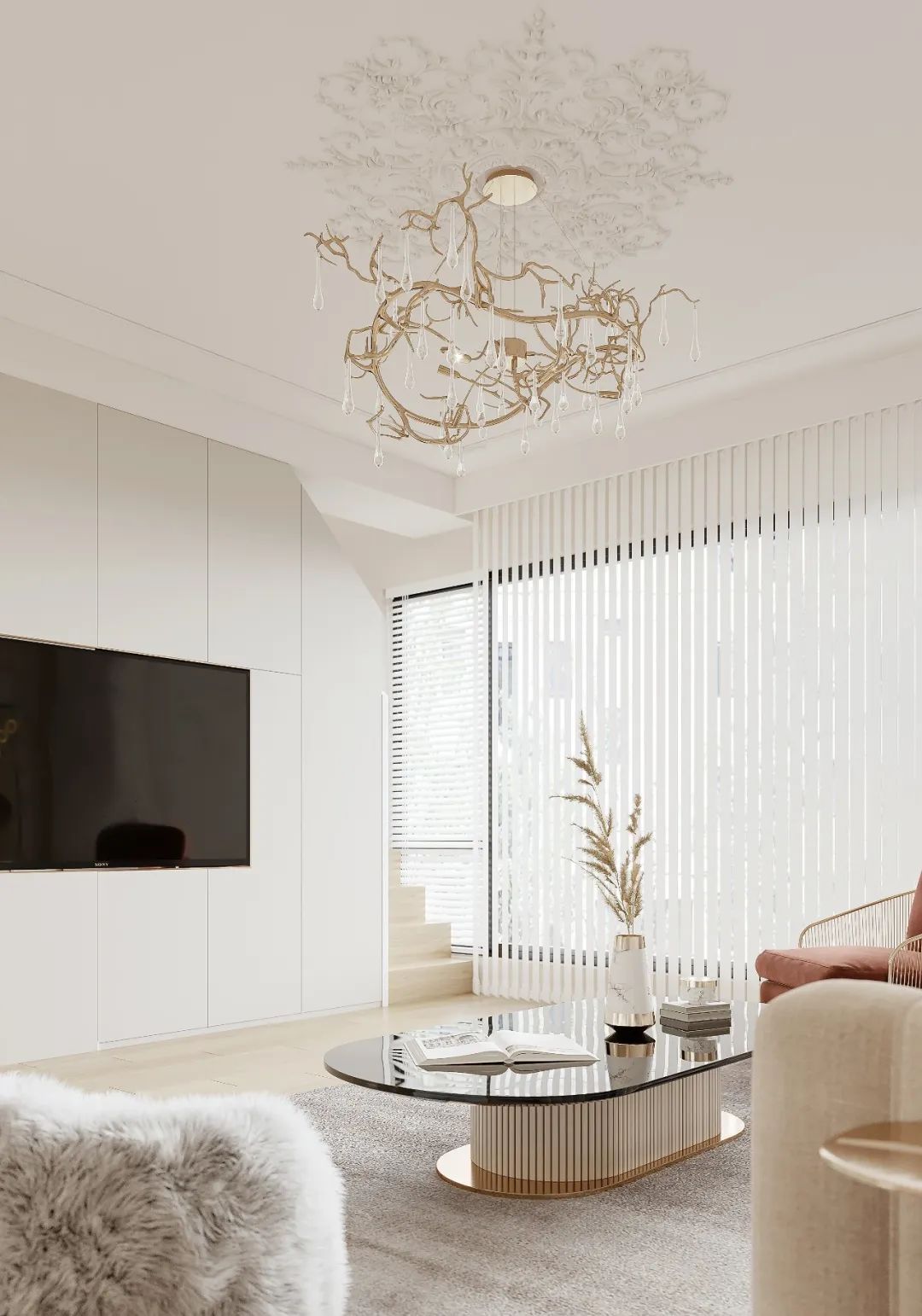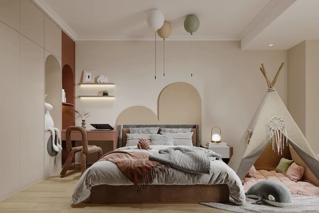用小羊皮構筑甜蜜的居所,甜蜜柔軟的氣息流轉于日常居所,搭配云朵形沙發和毛絨地毯,仿佛被親密暖的擁抱著。以自然輕松的方式共度時光,在不經意間淪陷于此。小羊皮低卡奶油配色,運用不同比例的弧形元素,搭配低飽和的暖色小羊皮,充分表達了極致溫柔的舒適與安全感。臥室通刷小羊皮涂料,溫暖的暖調藝術漆與溫潤的原木家具組合,帶來清新氣息和豐富的層次裝飾,低矮家具減少視線阻隔,舒適感直線up。